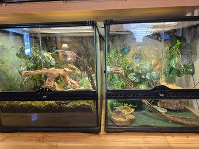 An adult crested gecko will thrive best in a vertical tank that is 20 gallons or larger. Since they are aboral, height is more important than floor space. A tall, glass terrarium with a screen lid for ventilation is a good option. We use 18 x18x 24 glass tanks for adults. For juveniles, light weight (non-glass) 10-gallon tanks that have dark sides are ideal as the young geckos feel more secure. Hatchlings do best in a small cage where they can find their food and water easily. Every size tank should have numerous climbing options, some ventilation, and plants (fake or live) so they can hide and feel safe. Placing waterproof re-writable labels on the tanks is a great way to keep track of the geckos.