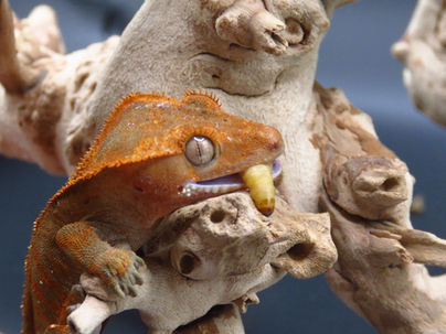 In addition to a complete powered food, you can offer gut-loaded (fed a nutritious diet) insects (e.g. crickets, dubia roaches, wax worms) once or twice a week. Wax worms are a good option because they lack a hard exoskeleton and are quiet (unlike crickets) and less likely to escape. They come in a container that can be stored in the fridge. Remember, insects should be no larger than the space between your gecko’s eyes and may be dusted with a calcium / vitamin D3 supplement.
